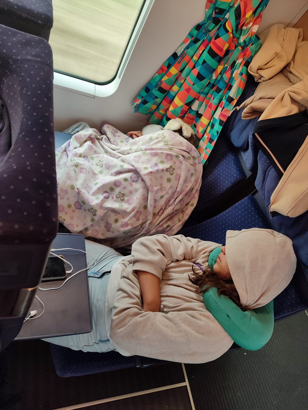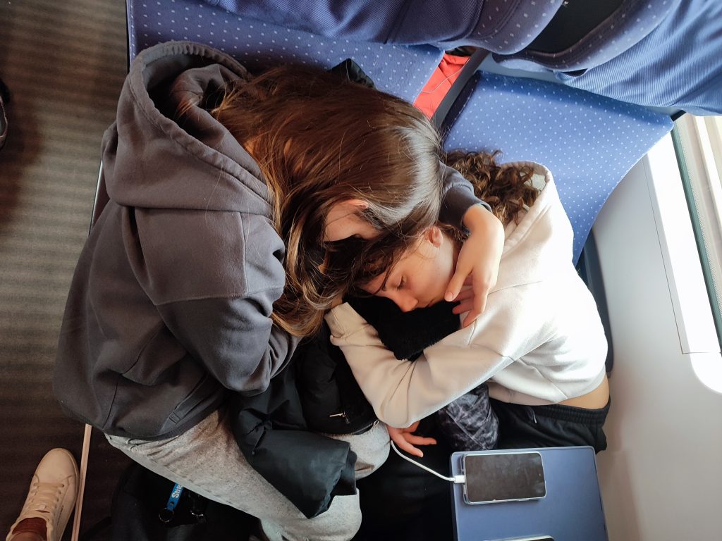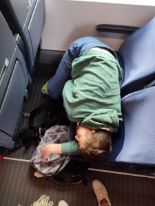 6h15 : réveil en douceur pour pouvoir être frais pour la correspondance. Horreur, nous avons finalement 5 minutes de retard et donc 6 minutes pour sortir du train avec tout notre bardage, descendre puis remonter les escaliers et remonter dans le train pour Paris. Nos loulous sont fantastiques car ils ont réussi l’exploit d’être sur le bon quai en moins de 2 minutes !!