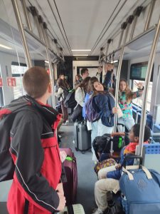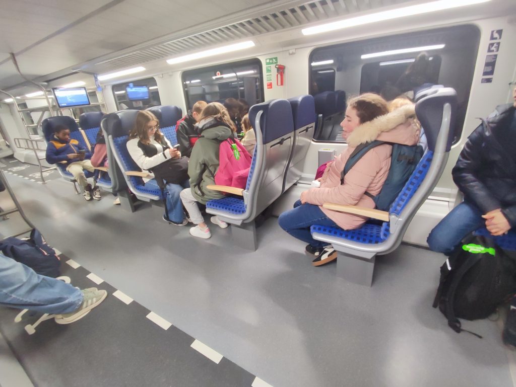 14h15 : nous disons au revoir à nos partenaires. Une photo souvenir et hop direction la gare pour monter à bord d’un train allemand rouge à double étage (une attraction pour nos Loulous).