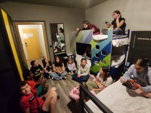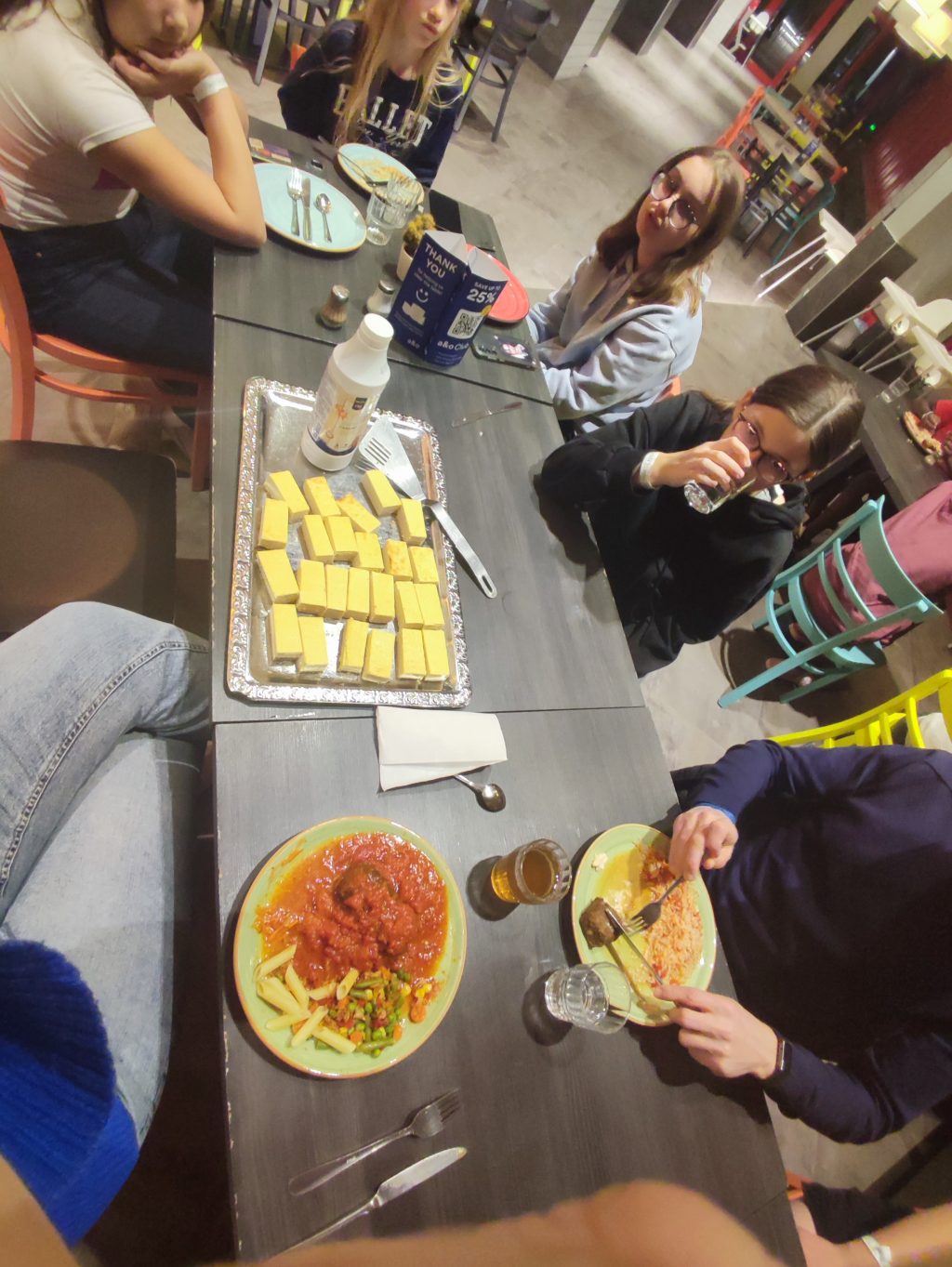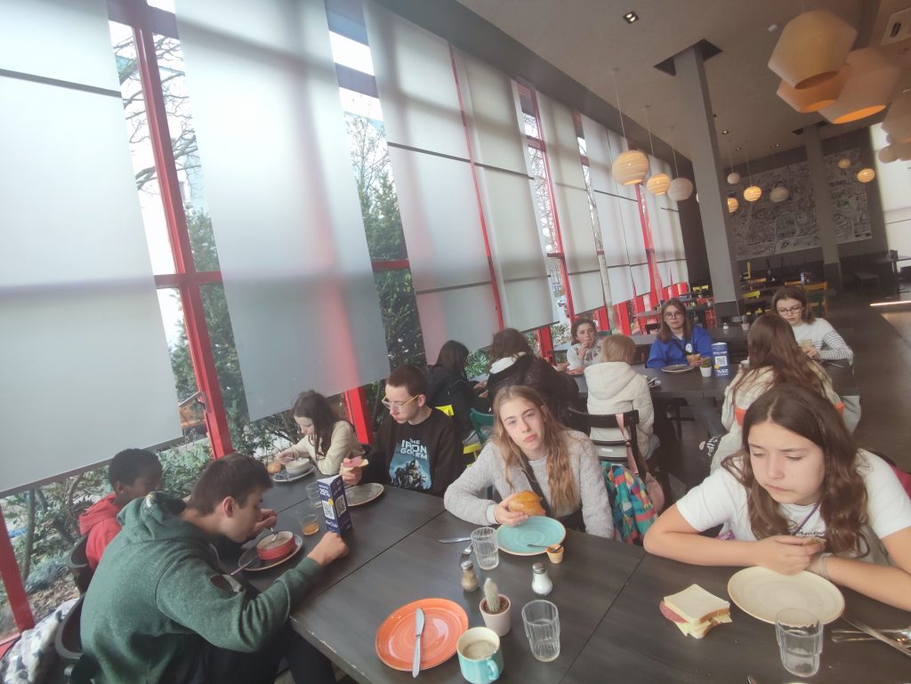 18h45 : retour à l’hôtel, douches, devoirs, repas (knepfles, veau en sauce, choucroute et crème au chocolat) puis jeu tous ensemble. L’installation est vraiment pas top mais au moins on est au calme et entre nous.