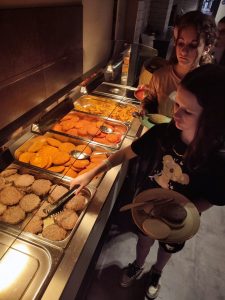 20h : nous allons manger. Au menu on a le choix entre nuggets, steak haché, snitzel végétarien, potatoes (oui encore) et carottes vapeur. En dessert, car oui là il y en avait : pancakes et compote de pommes.