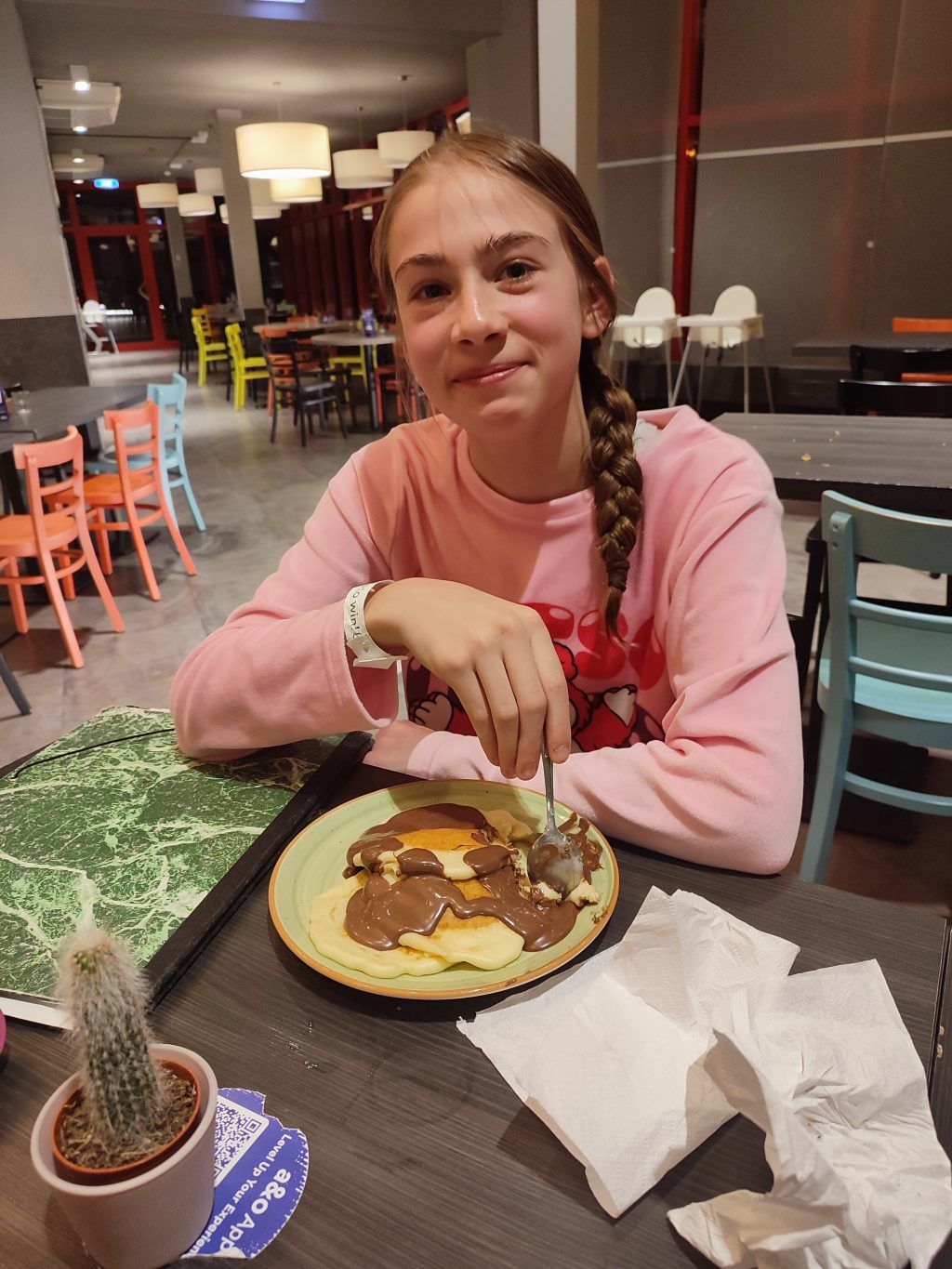 8h20 : on descend préparer les pancakes au chocolat pour nos loulous qui profitent enfin d’une grasse matinée. Manque de bol, la machine à pancakes ne fonctionne plus et le pot de chocolat est vide…. Échec dès le lever.