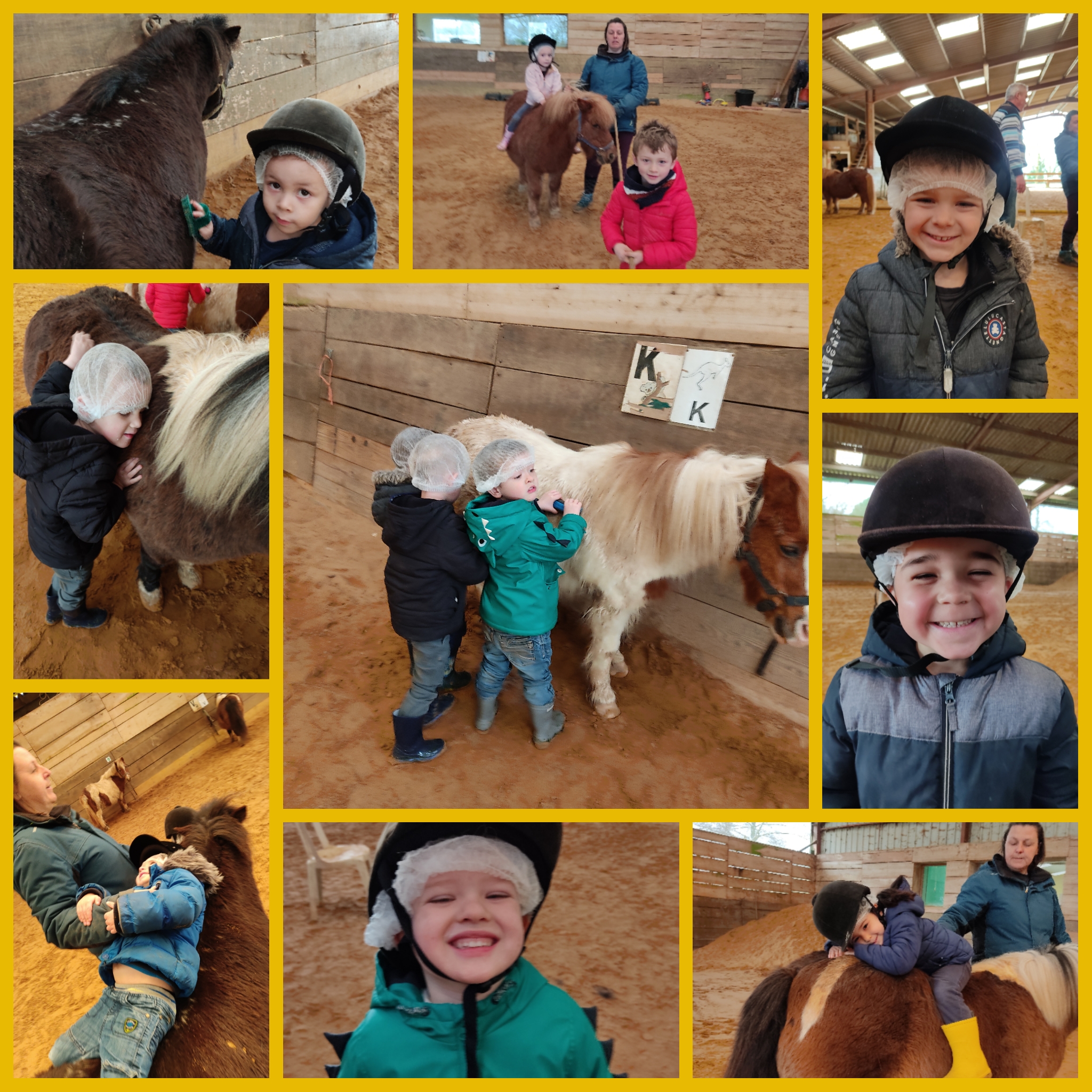 Pendant que l’autre groupe de PS MS fabriquait à son tour du pain, nous sommes allés voir les poneys : Boston, Granola, Ubine, Roméo et Minou attendaient leur séance de gratouilles avec les brosses et les étrilles.