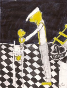 “Les illustrations de ce livre sont originales et très recherchées, c’est pour cela que nous les trouvons jolies. Ce livre raconte une guerre affreuse et beaucoup d’amour. Mais nous trouvons qu’il n’y a pas assez d’action. La manière dont il a écrit cette histoire en forme de poème est très bien formulée. Dans chaque illustration on peut y trouver une fleur entourée d’une lumière jaune qui fait penser à des flammes et qui représente la femme et un oiseau représentant le messager de leur amour.” Lucie et owen