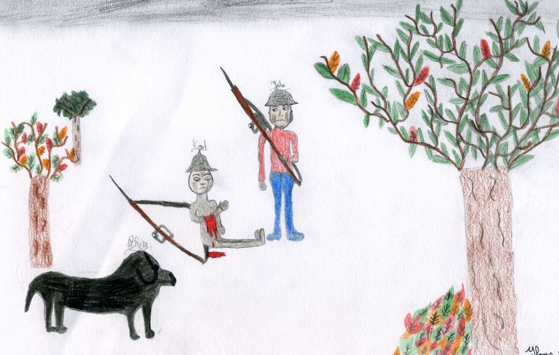 Quand soudain un régiment débarque puis bouscule les personnes. Les deux soldats français leur portent secours. Pendant la bataille, un des soldats français laisse tomber un paquet. L’enfant le ramasse et le donne à l’autre soldat français. Le commandant était stupéfié car dedans il y avait une oreille coupée.