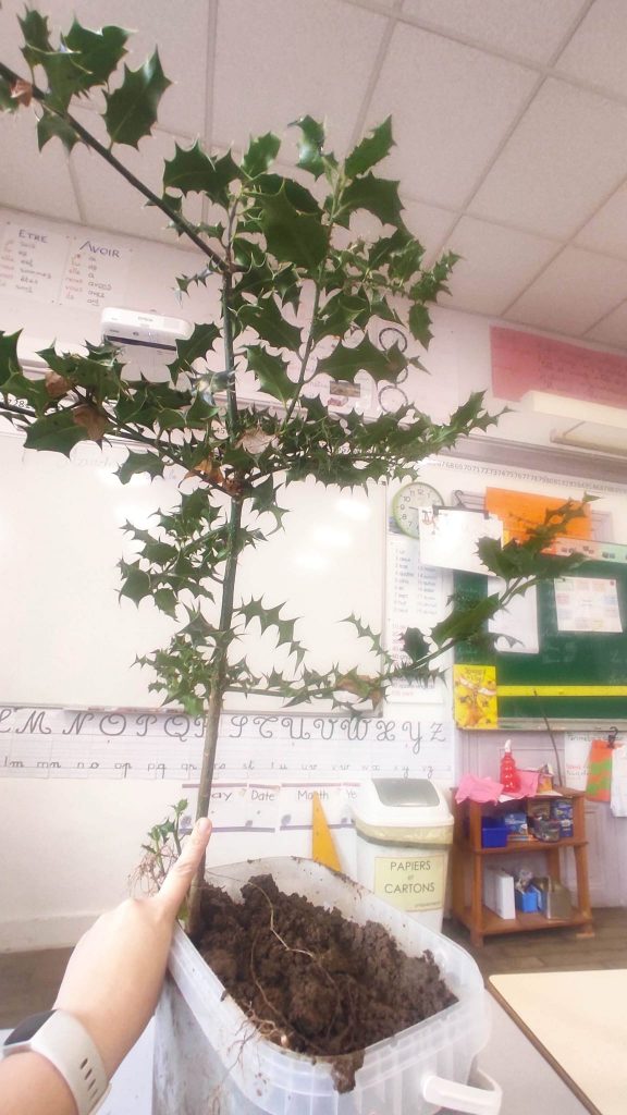 Nous avons fait une promenade Ă cĂŽtĂ© de l’Ă©cole, sans trouver de houx. MaĂźtresse en a ramenĂ© un de chez elle. Nous allons installer ce houx dans un coin de notre jardin. On a choisi cet endroit parmi six lieux que nous avions en classe dehors (sur l’aire terrestre, Ă cĂŽtĂ© de l’Ă©cole ou dans l’Ă©cole) parce qu’il y a de l’ombre, de la fraicheur et un espace. Il sera protĂ©gĂ© du vent, du soleil et des passants. Nous avons votĂ© avec la classe des CP-CE1 aprĂšs avoir rĂ©flĂ©chi aux lieux possibles avec les GS-CP et CE1.