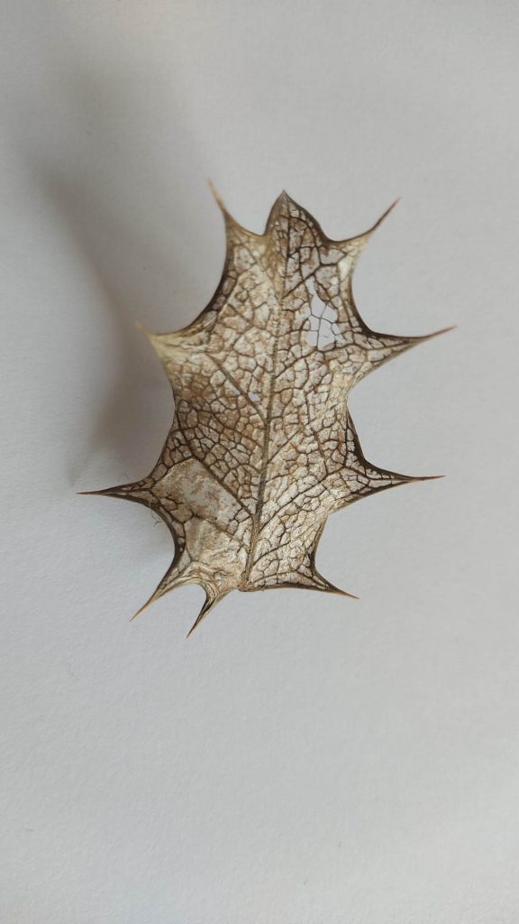 Sur le houx, nous avons appris qu’il a des feuilles pointues, vertes, des nervures que l’on voit bien sur la feuille morte et ce sont des feuilles persistances, qui rĂ©sistent au froid et ne tombent pas en automne. Il a aussi des petites boules rouges, des baies, qui ne sont pas comestibles pour les humains mais pour les oiseaux.