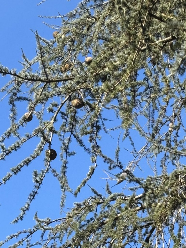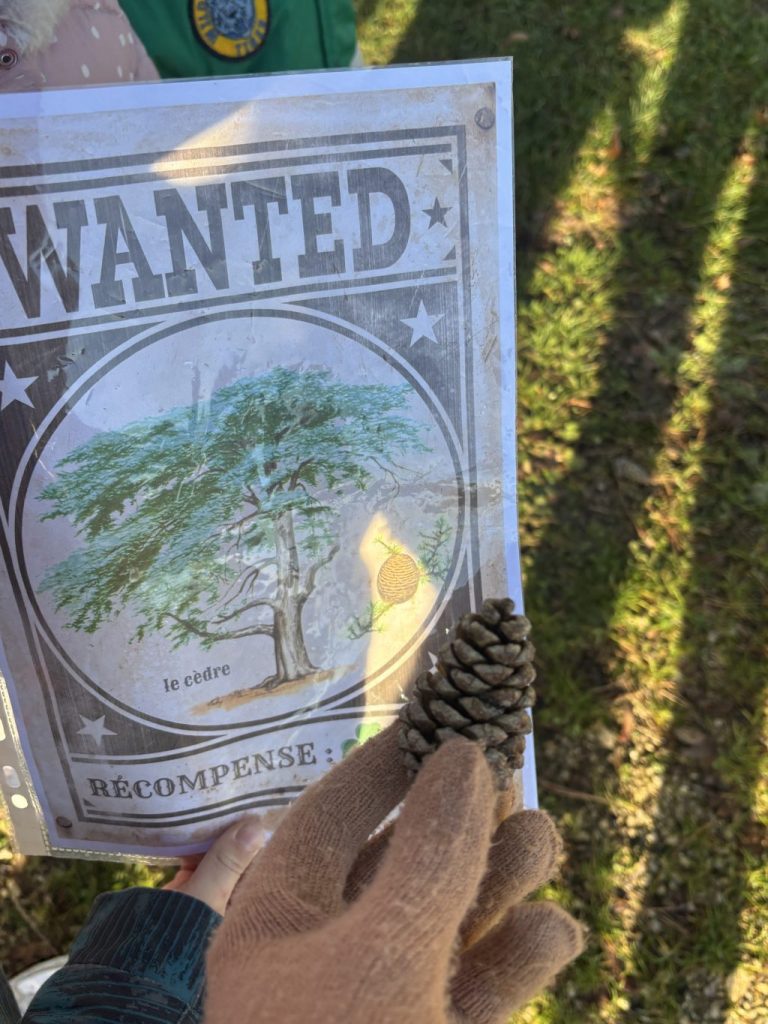 Munis de notre affiche, nous comparons les cônes que nous cherchons avec les différentes pommes de pin que nous trouvons. Nous regardons aussi les aiguilles (qui forment comme des touffes et sont petites) et l’aspect général de l’arbre.