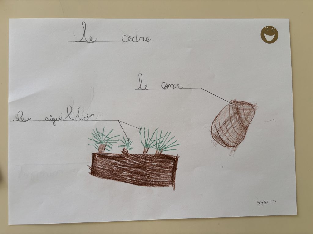 Enfin, nous découvrons ce que nous cherchons ! Nous avons même eu la chance de trouver un cône par terre (grâce aux yeux de lynx de Gabriel) ainsi que quelques branches que nous avons rapportées en classe pour les observer puis en faire un schéma légendé.