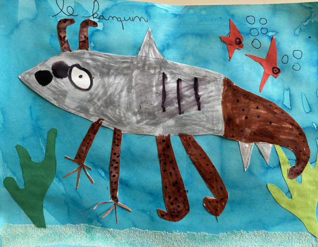 Voici maintenant le Kanquin de Gabriel. Il a croisé sa route à l’Ile Maurice, où il a eu la chance d’aller en vacances. Gabriel a vu un aileron, et le Kanquin est sorti de l’eau en sautant! Il a dressé ses oreilles et Gabriel s’est vite enfui pour ne pas se faire manger! Heureusement, le Kanquin mange surtout des poissons.