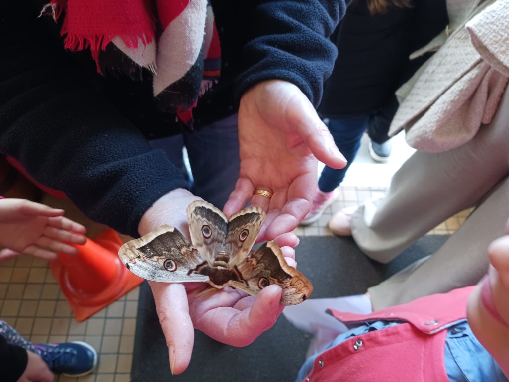 Jeudi 17 avril, nous avons trouvé deux paons de nuit dans la cour de l’école. Ce sont les plus grands papillons d’Europe. L’un d’entre eux mesure environ 14 cm.