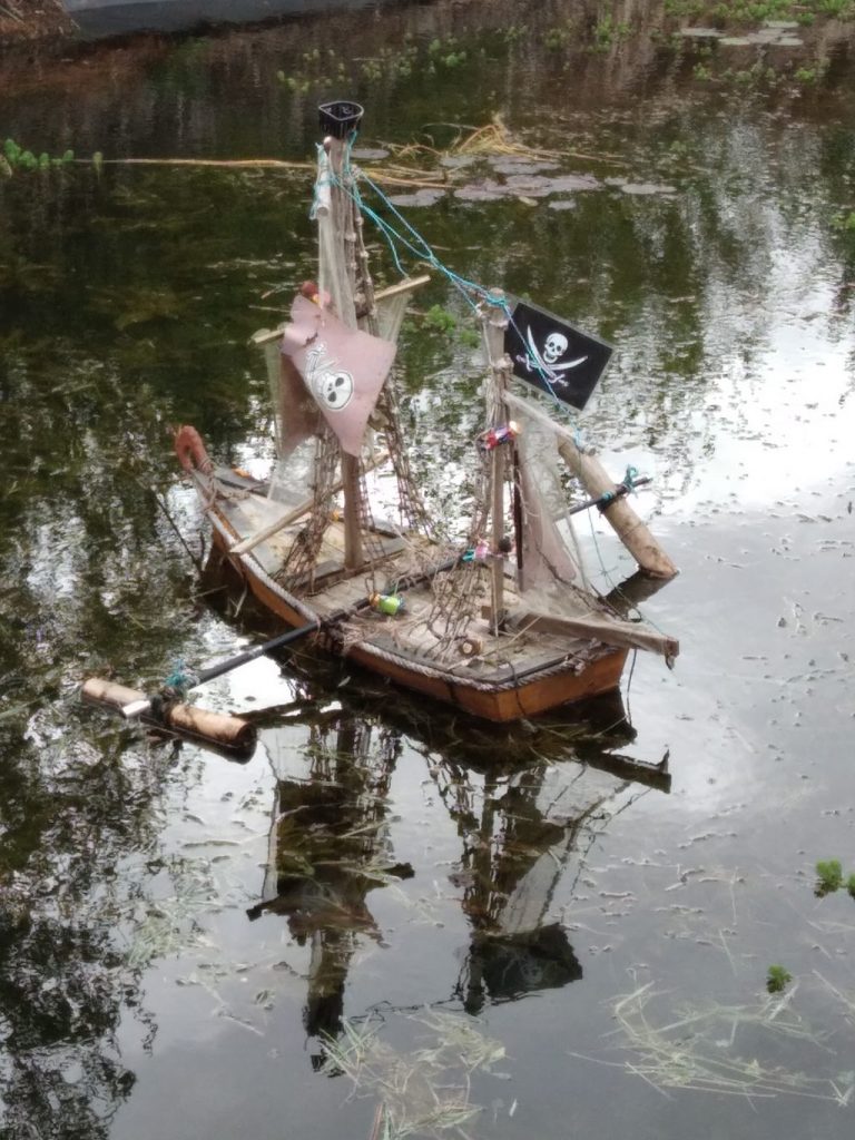 Dans la mare, il y a même un bateau de pirates !