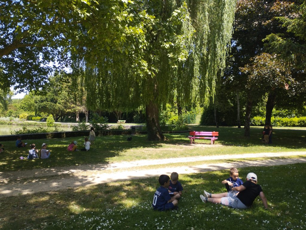 Plusieurs élèves ont réagi quand ils ont entendu parlé de la quête du mois de mai car ils savaient qu’il y avait des saules pleureurs au jardin public de Chauvigny. Nous y sommes donc allés pour étudier un beau spécimen. Travailler dans l’herbe est quand même plus agréable.