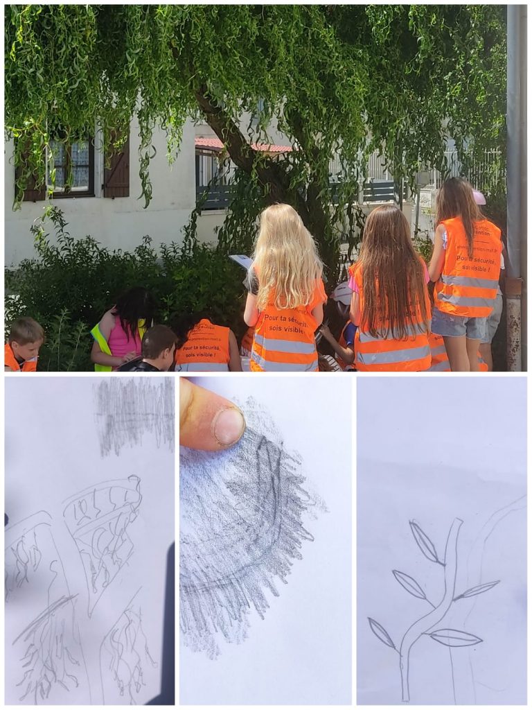 Pendant une autre balade à vélo, nous avons une pause à la mairie pour admirer le saule tortueux. Il a les feuilles, le tronc et les branches tous tordus. Nous l’avons dessiné et nous avons « décalqué » les feuilles déjà tombées en passant du crayon dessus.