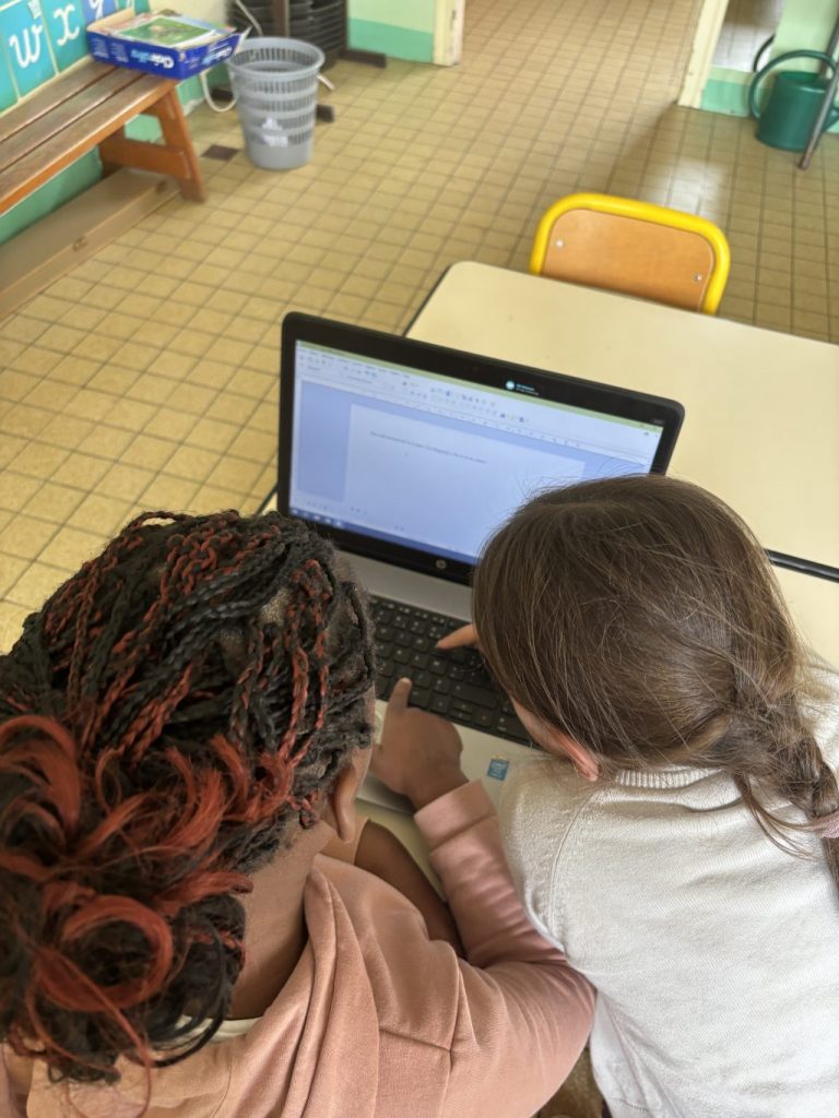 Les GS en plein travail de transcription: regarder l’écrit en cursif au tableau, trouver les lettres correspondantes en capitales sur le clavier et les taper, pour enfin vérifier sur l’écran en script! Un gros travail, bravo les GS!