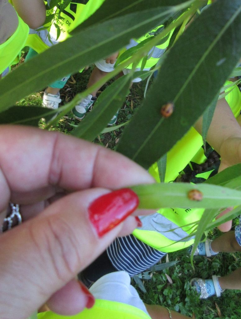 Nous avons cherché un bon moment la coccinelle et au moment de partir, Tobias l’a repérée sur les feuilles du saule pleureur.