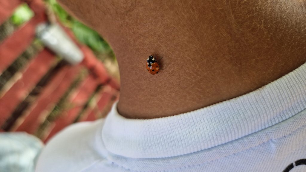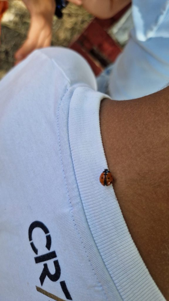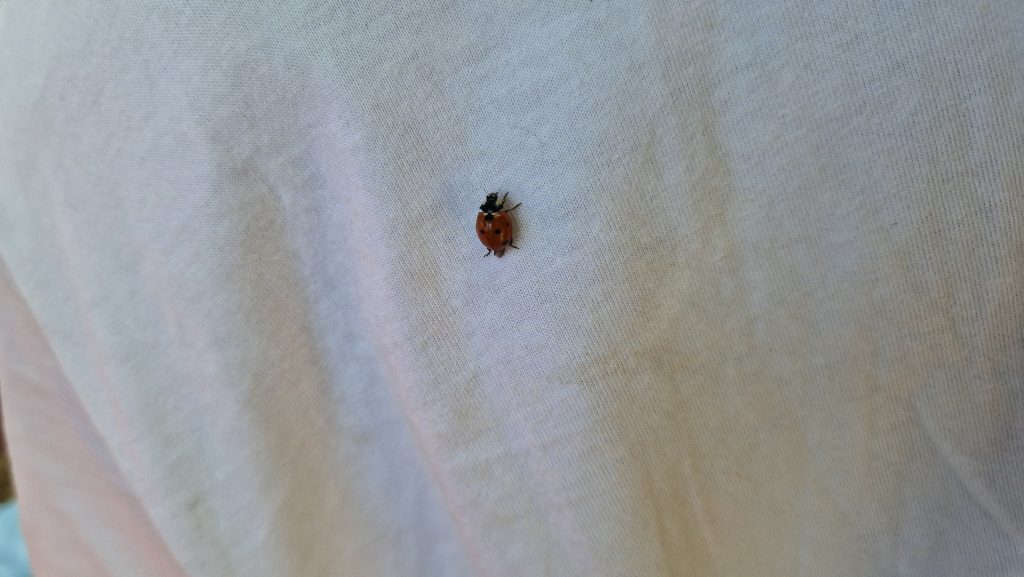 Durant toute la journée, nous avons vu beaucoup de coccinelles asiatiques et en rentrant à l’école, une coccinelle à sept points est venue se poser sur le t-shirt de Kelani.