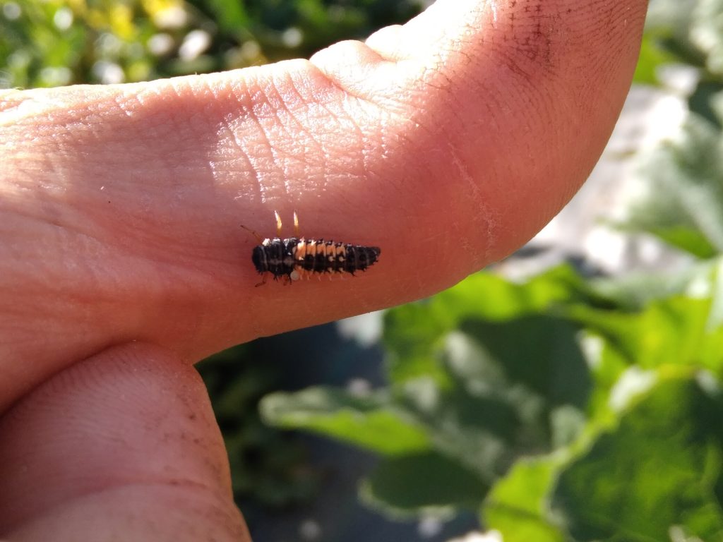 Loïs, du jardin d’insertion, avait tout un tas de coccinelles qui mange les pucerons. Il y avait aussi des larves de coccinelles.