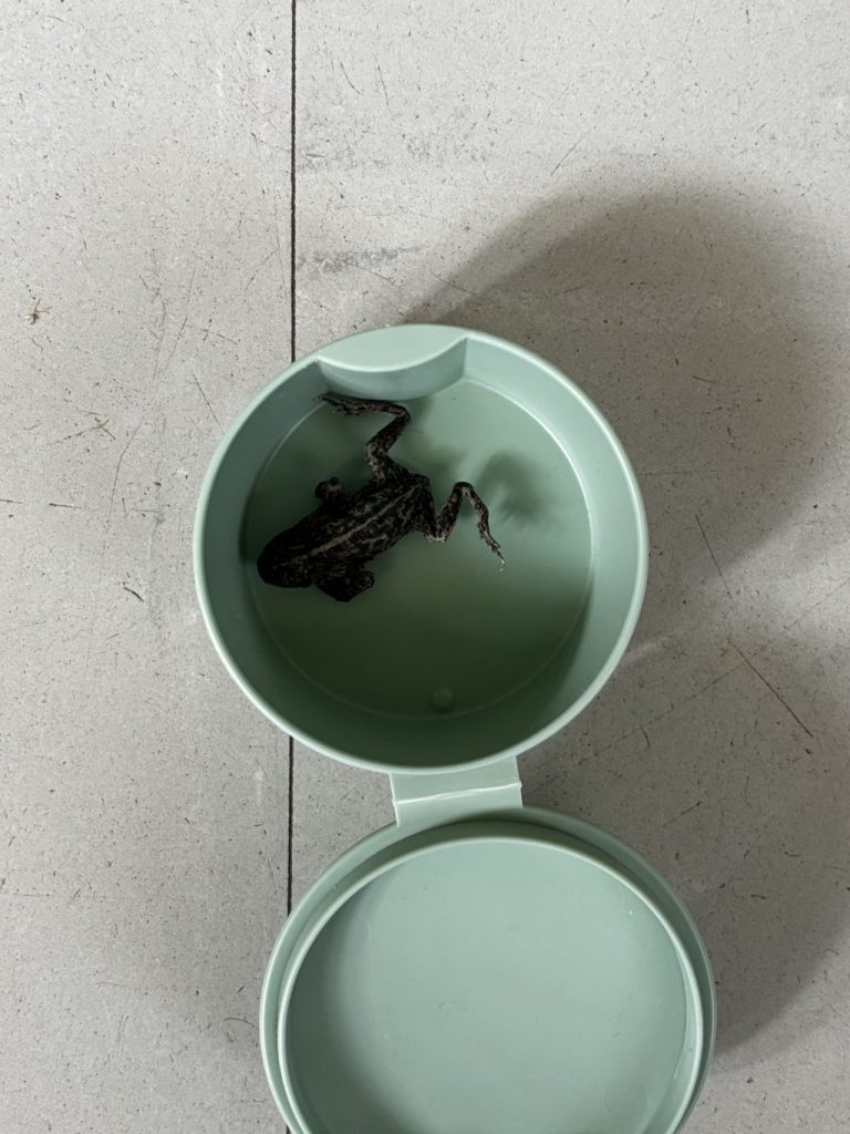 Elyna a trouvé une grenouille sur le bord de sa piscine dans le dôme. Elle était toute sèche, verte, blanche et noire.