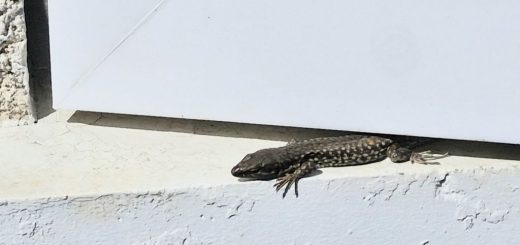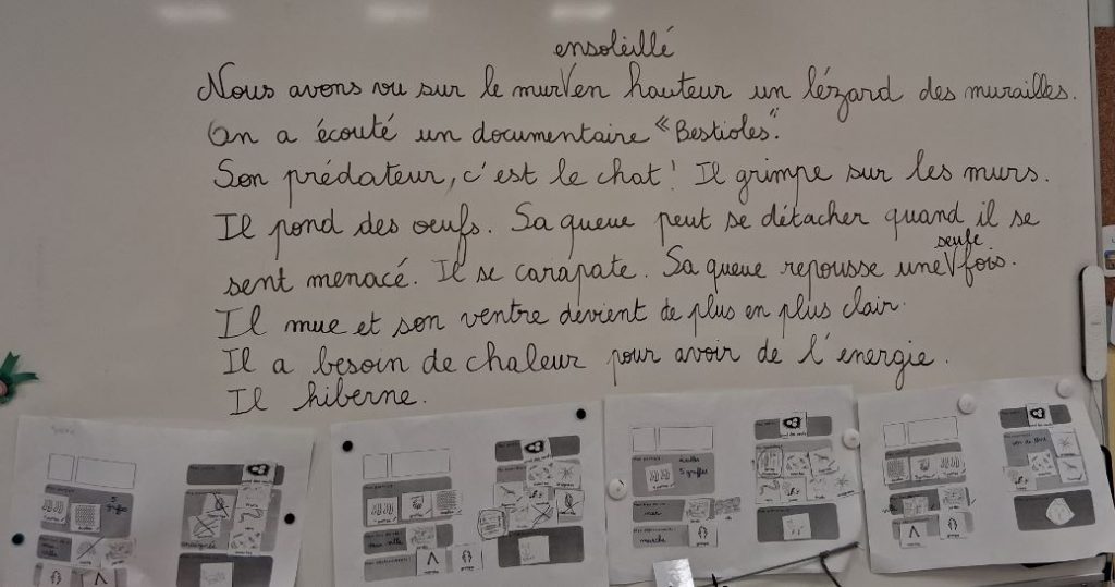 En dictée à l’adulte (CP) : “Nous avons vu sur le mur ensoleillé, en hauteur, un lézard des murailles. On a écouté un documentaire “Bestioles”. Son prédateur, c’est le chat! Il grimpe sur les murs. Il pond des œufs. Sa queue peut se détacher quand il se sent menacé. Il se carapate. Sa queue repousse une seule fois. Il mue et son ventre devient de plus en plus clair. Il a besoin de chaleur pour avoir de l’énergie. Il hiberne.”