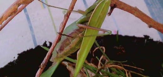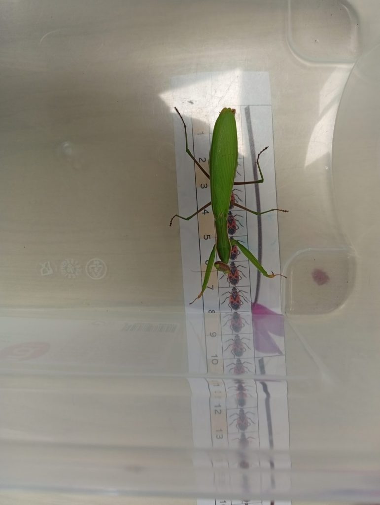 On a trouvé une mante religieuse sur l’escargot de la cour de l’école. Elle a 6 grandes pattes, ça fait comme des crochets au bout et elle s’accroche avec. Des fois, elle plie ses pattes de devant. Elle a une petite tête mais ses yeux sont très gros.