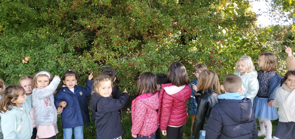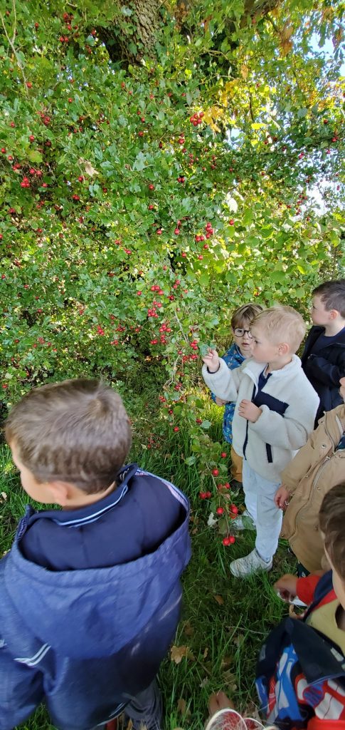 Ce matin, nous sommes partis à la recherche d’ aubépine, dans les haies autour de l’école car Suzanne en avait vu ce week-end avec ses parents.
