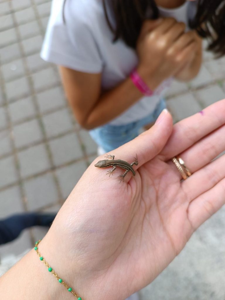 Le petit lĂ©zard sur la premiĂšre photo est un lĂ©zard que nous avons trouvĂ© dans les couloirs de l’Ă©cole, nous l’avons pris sur notre main pour le remettre Ă l’extĂ©rieur. Il Ă©tait tout petit et avait la queue coupĂ©e…