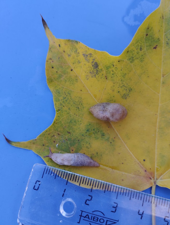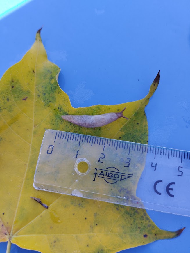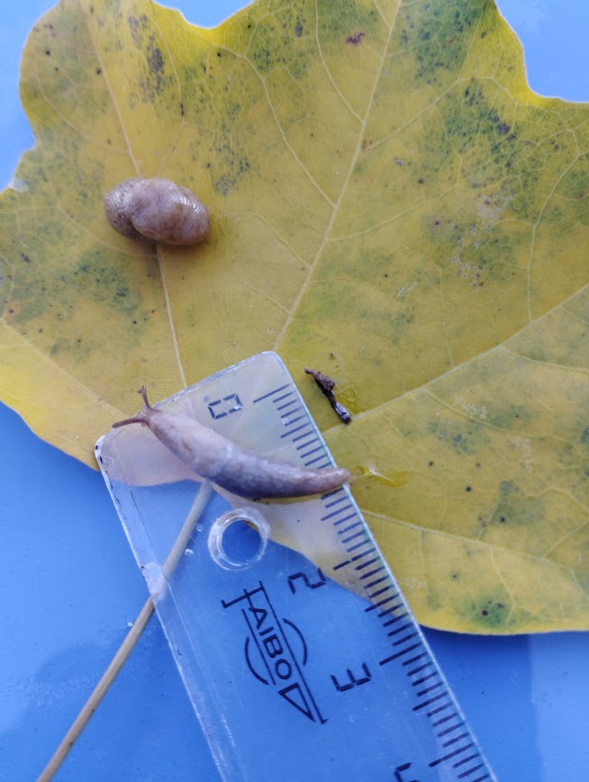 Nous avons réussi à en trouver dans les hautes herbes humides à l’ombre. Nous avons trouvé des petites limaces nommés “La petite limace grise ou la Loche laiteuse”. Ces limaces se mettent presque en boule lorsqu’on les touche. Puis elles s’allongent, sortent leurs antennes et avancent plutôt vite, il n’était pas si facile de poser la règle à côté d’elle pour la mesurer. La notre mesure environ 2-3 cm.