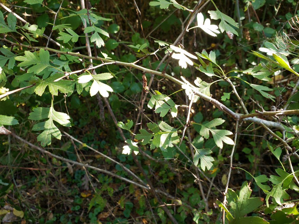 Nous avons trouvé une seule aubépine sur le chemin qui nous mène dans les bois. Elle n’avait pas de fruits rouges.