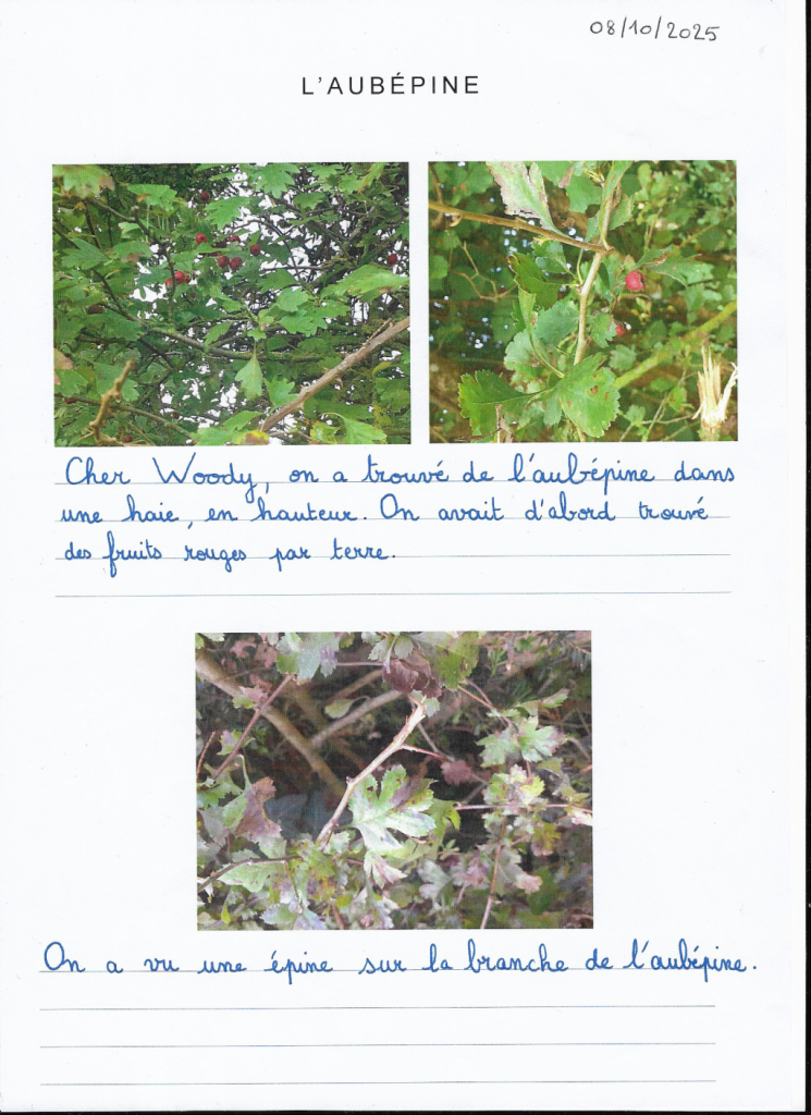 Aubépine à Verrières 🍀 par mguenard · 12 octobre 2025 COMMUNE : Verrières ÉCOLE : École J. Berry DATE : 08/10/25 LIEU : dans une haie DÉCOUVREUR(S) : les élèves de la classe MESURES : – COULEUR(S) : – ESPÈCE : aubépine AUTRES INFORMATIONS : – EN SAVOIR PLUS : Vikidia – Wikimini – Wikipédia [Racontez ici votre découverte]