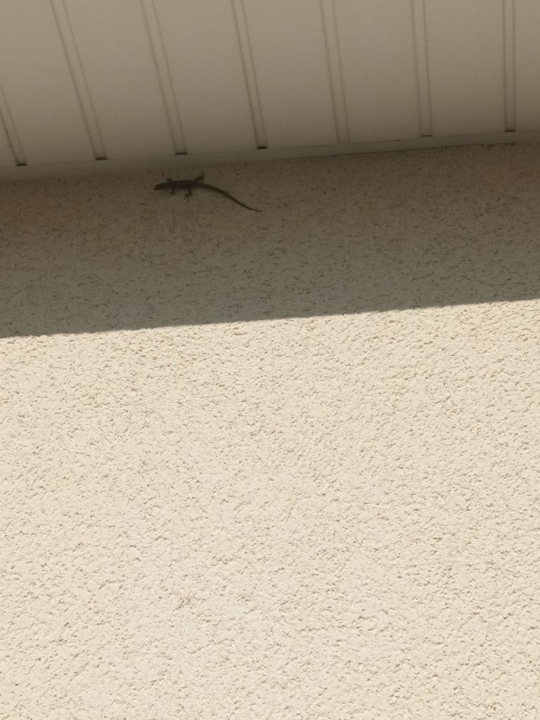 On a trouvé un lézard. On l’a vu dehors, sur le mur. Il était au soleil. Il était vert et petit et fin. Il avait une queue longue et verte. Il avait 4 pattes.