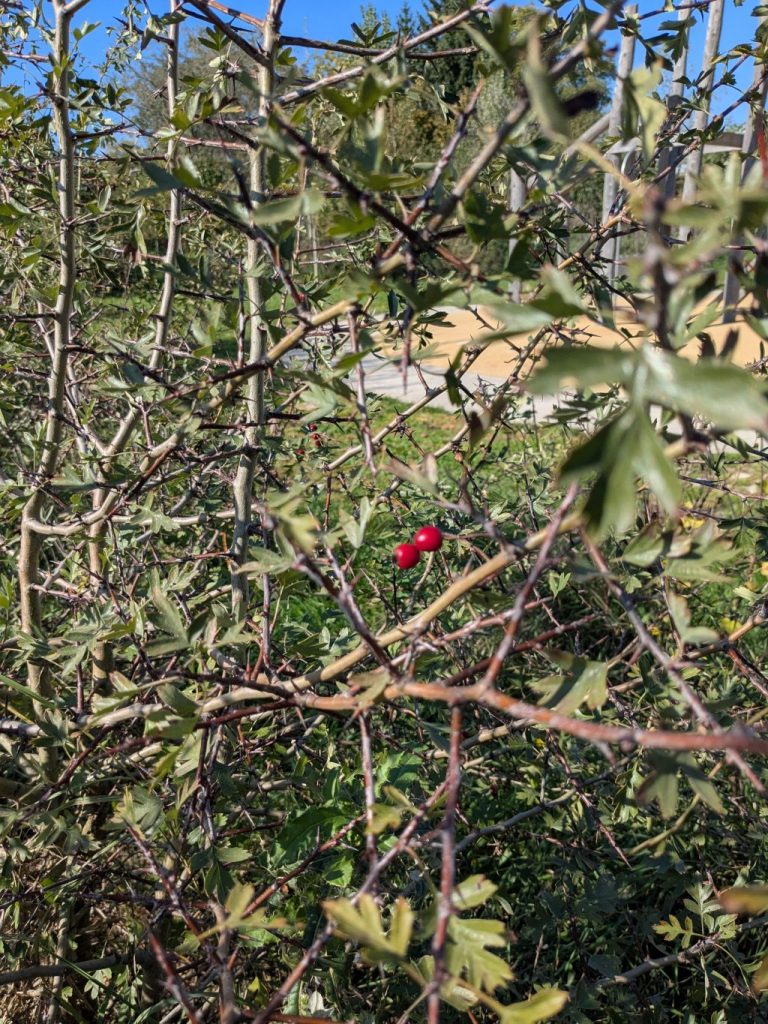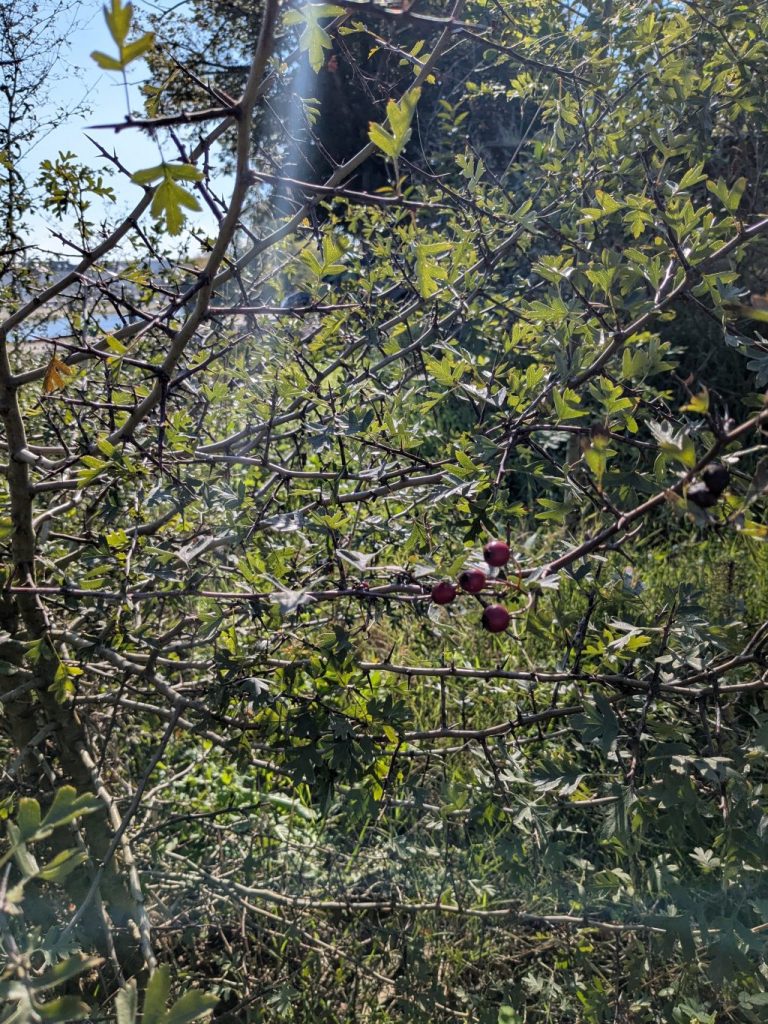 Nous avons été au bord de la Vienne. On a trouvé des aubépines. On a touché en faisant très attention les épines. On a cueilli des feuilles pour les faire sécher et les garder. En même temps on a trouvé une chenille !