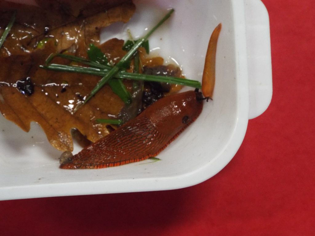 La mamie de Tristan nous a apporté deux limaces, une grande orange et une petite orange pùle.