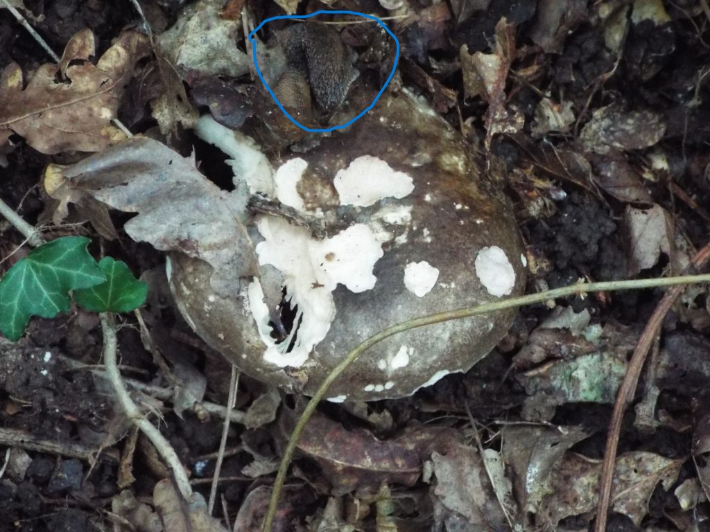 Jeudi 9 octobre, nous sommes partis dans les bois chercher des limaces. Il y avait des champignons mangĂ©s par les limaces… et une limace grise tout prĂšs !