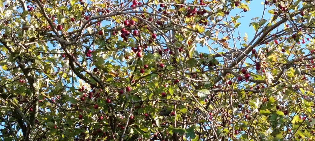Nous savions qu’il y avait de l’aubépine dans la rue qui descendait “aux ânes” car les grands nous l’avaient dit ! Mais nous ne savions pas exactement l’endroit. C’est en marchant, alors que tout le monde regardait ses pieds, qu’un élève a remarqué des petites boules rouges mélangées à du lierre… Nous avons levé les yeux et de grandes branches avec des feuilles dentelées et beaucoup de cenelles étaient au dessus de nous.