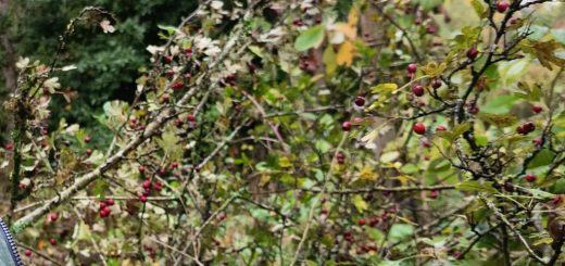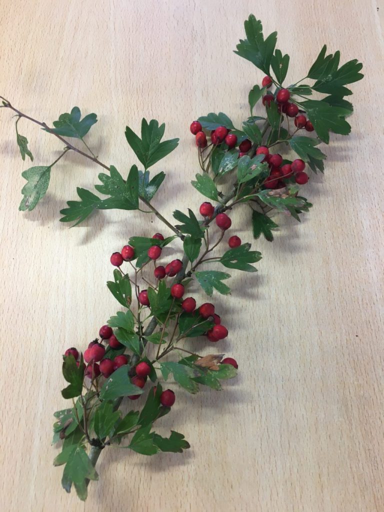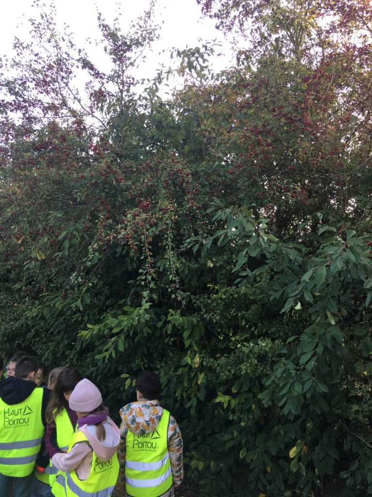 Nous avons reconnu l’aubépine grâce aux explications de Woody : les fruits rouges, les feuilles et la hauteur de l’arbre entre 3 et 4 mètres. Nous avons vu beaucoup d’autres plantes avec des fruits rouges.
