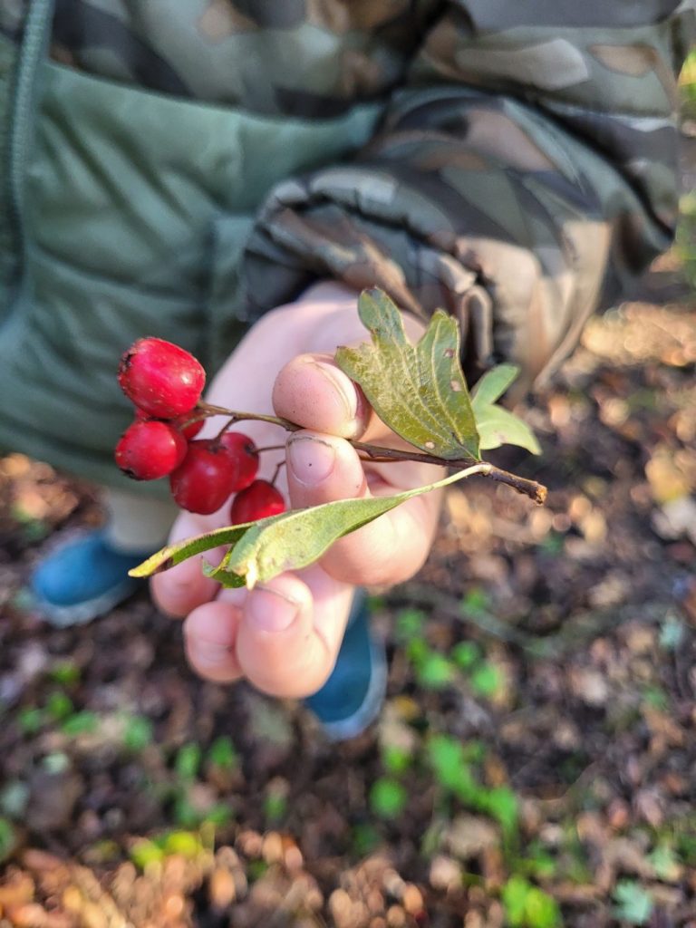 Un peu plus loin sur le chemin, Timaël a trouvé une petite branche au sol avec des boules rouges. Nous avons bien observé ses feuilles, c’était cette fois-ci de l’aubépine !!!