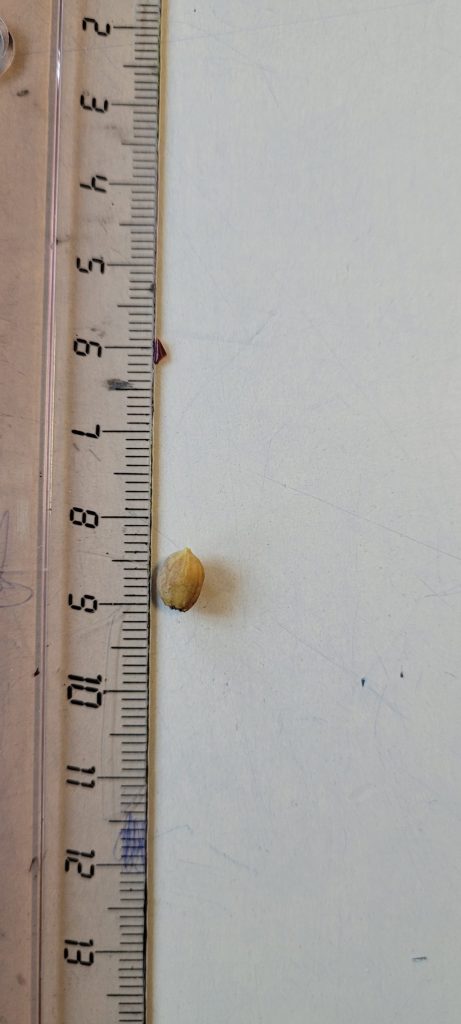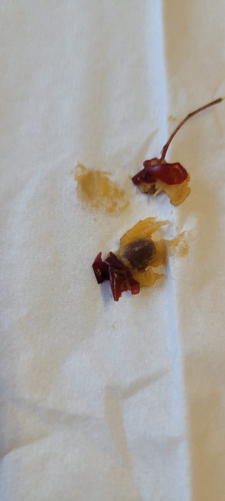 A première vue, il a l’air un peu dur mais quand on le presse, il s’écrase. On voit que la peau rouge du fruit est très fine. La chair est de couleur jaune et à l’intérieur il y a un noyau. Le noyau fait environ 4mm de large sur 6 de long. Il sent légèrement l’abricot. Le fruit, qu’on appelle cenelle, est comestible. Certains animaux les mangent.