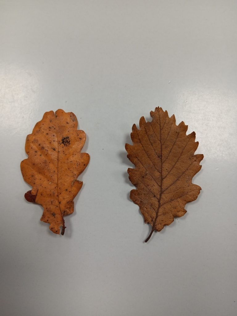 On a mis une photo de deux feuilles : à gauche, il y a la feuille du chêne pédonculé et à droite, celle du chêne de Hongrie.