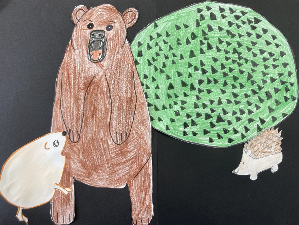Quand Monloulou en sortit, il était couvert d’épines, ça lui faisait un peu mal, ça lui tirait la peau. Il se remit en boule en voyant l’ours. Celui-ci essaya de l’attraper et se piqua les coussinets avec les épines. Il eut très mal et il partit en courant dans la forêt. Monloulou , en voyant cela, se rendit compte que d’avoir des piquants sur le dos protégeait des prédateurs. Il alla raconter son histoire à ses copains hérissons qui allèrent tous se rouler dans le buisson d’épines noires.