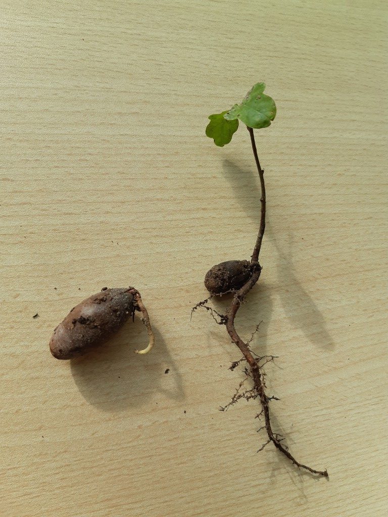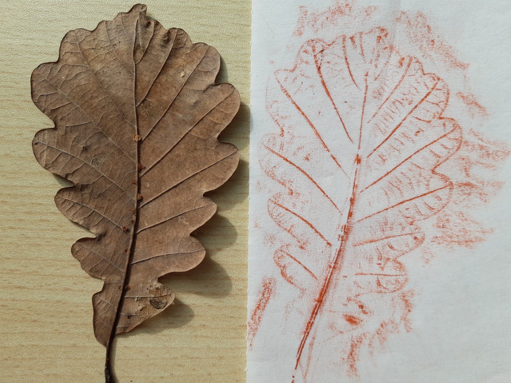 Sur le sol, nous avons trouvé quelques glands et vu beaucoup de jeunes pousses de chênes. Nous en avons récoltée une que nous avons rempotée en classe ; dans le pot, nous avons aussi planté un gland qui commençait à germer. Les GS ont frotté des feuilles mortes de chêne avec des craies grasses pour faire apparaître leurs nervures.