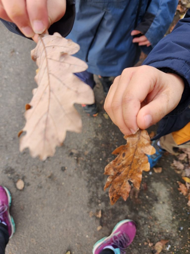 On s’en est rappelé. Alors on est retourné dans la rue qui s’appelle la rue du sentier Laron. Il y avait pleins de feuilles de chêne sur le trottoir. Elles étaient ondulées et mesuraient 10 gendarmes. Le chêne ondulé était dans un jardin. On ne voyait pas son tronc car il y avait une haie. On voyait ses branches qui dépassaient par dessus. On pense qu’il mesure environ 3 fois la grandeur de notre maîtresse.
