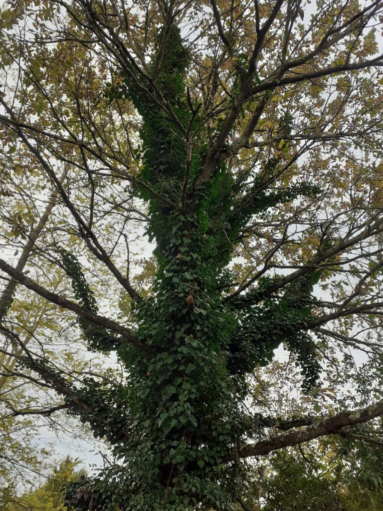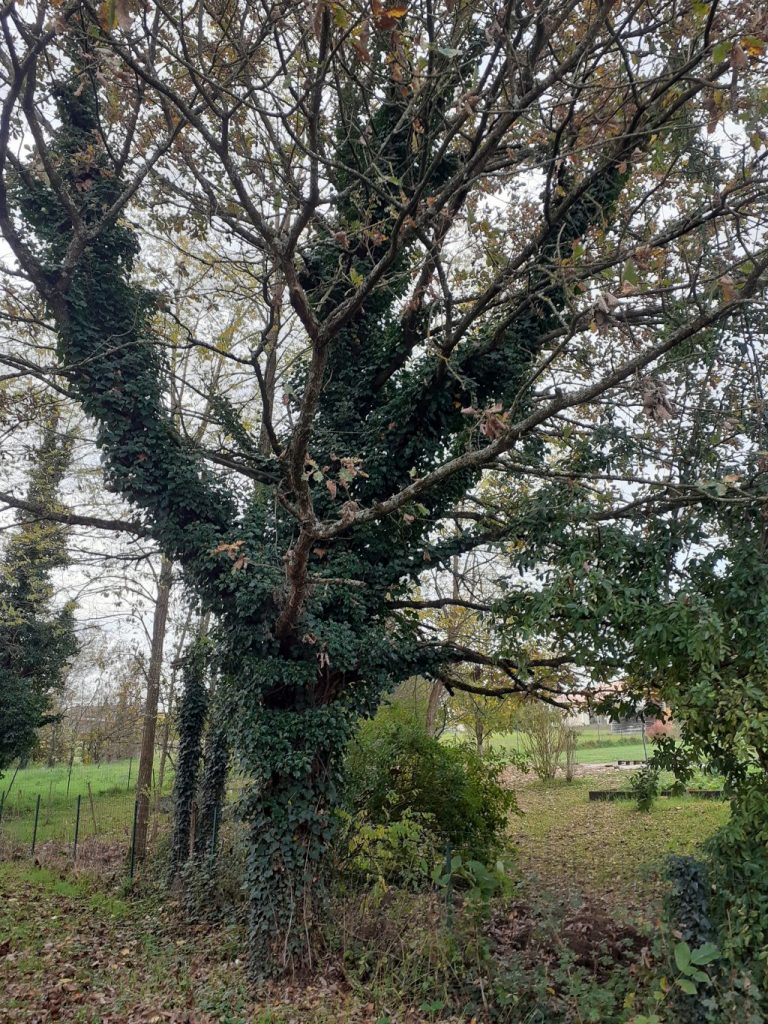 Le tronc est recouvert de lierre, on ne peut pas voir son écorce.