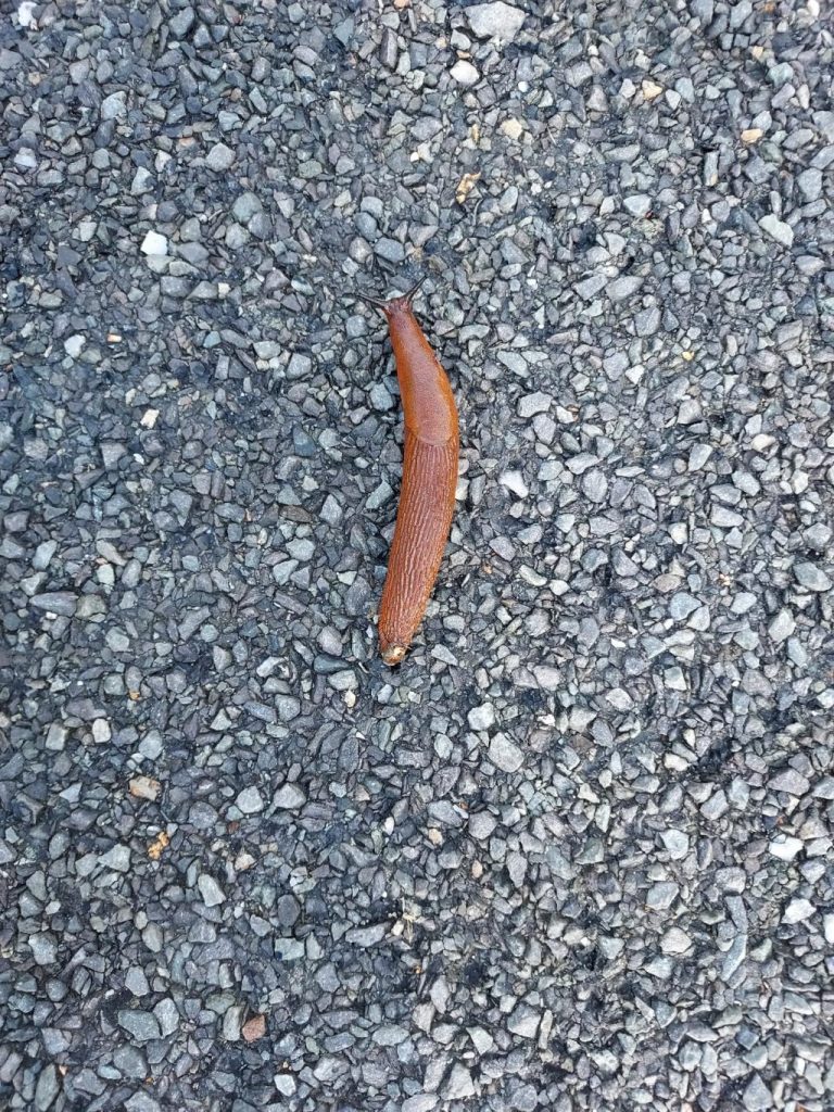 TraversĂ©e d’une limace sur la route de SaulgĂ© Ă Montmorillon pendant les vacances d’automne