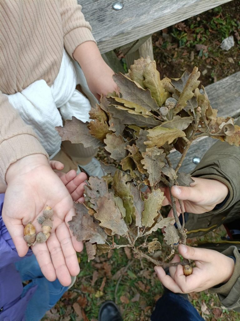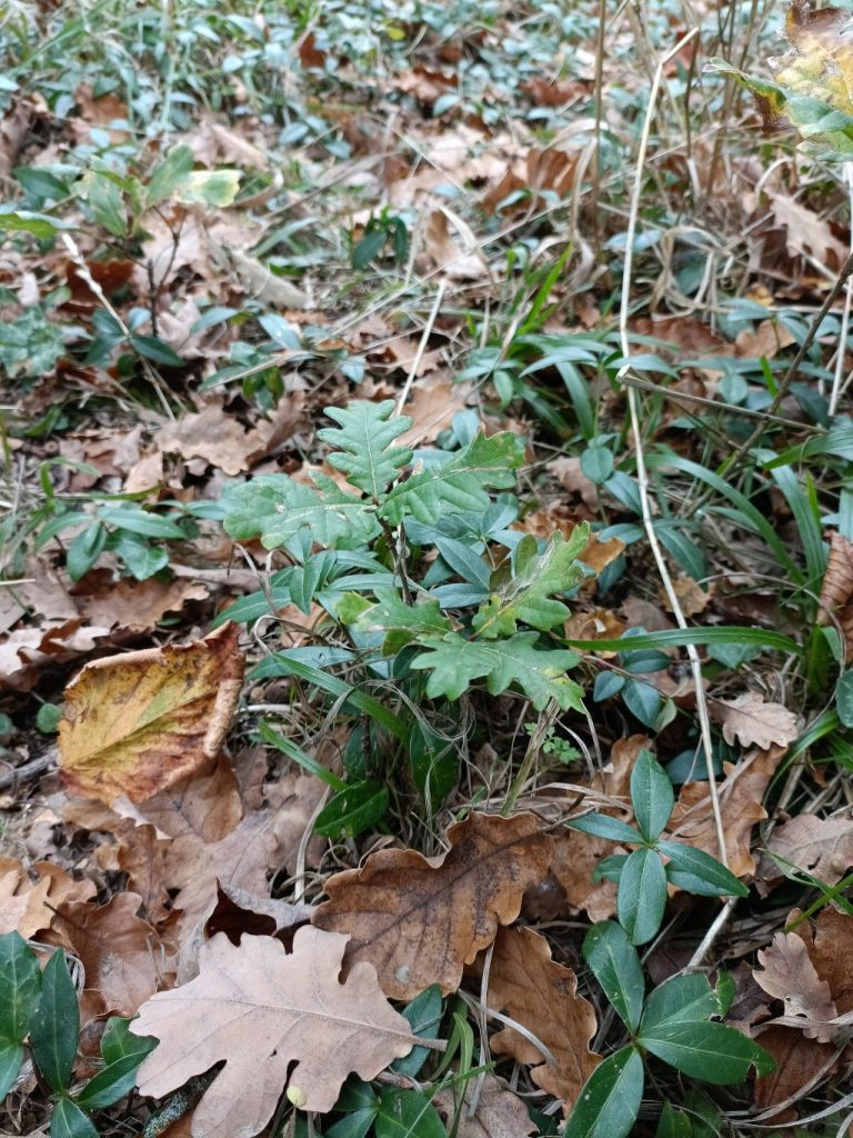 Là-bas, nous avons cherché un chêne et nous avons trouvé beaucoup de très grands chênes mais aussi de très petits chênes qui poussaient là où les glands étaient tombés.