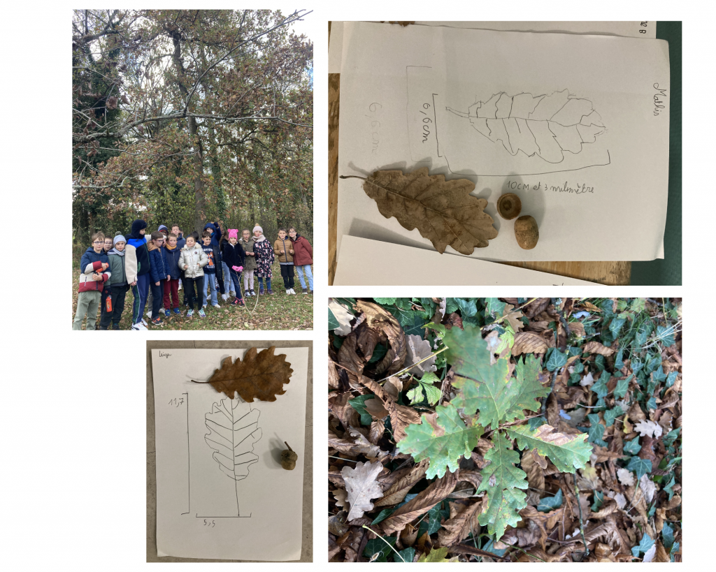 Nous sommes allés au petit bois de la commune pour avoir plus de chances de trouver un chêne. Nous en avons trouvé de plusieurs tailles.