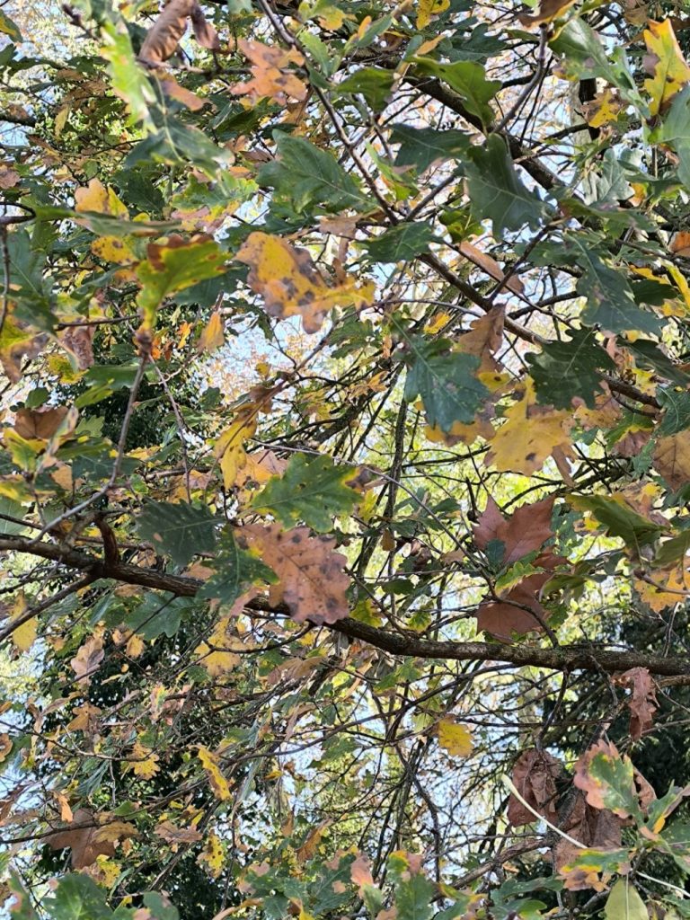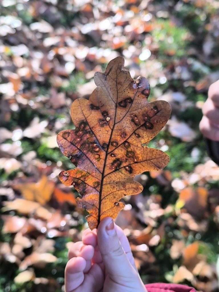 Nous avons d’abord trouvé des feuilles de chêne au sol. Nous avons regardé autour de nous mais nous n’avons pas trouvé tout de suite le chêne.