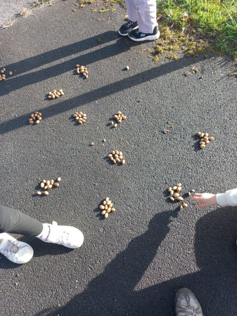 Comme il y avait beaucoup de glands sur le sol, on a fait 10 paquets de 10 glands (des dizaines) pour faire des paquets de 100 (des centaines).