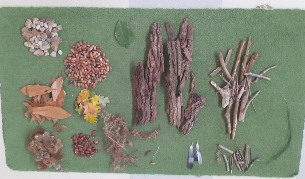 Nous avions trouvé des chênes au mois d’octobre en allant pique-niqué à la forêt de Châtellerault. Nous avions ramassé des glands et d’autres trésors : des écorces, des châtaignes et leurs bogues, des morceaux de bois, des cailloux, des feuilles de chêne, de châtaigner, des plumes…
