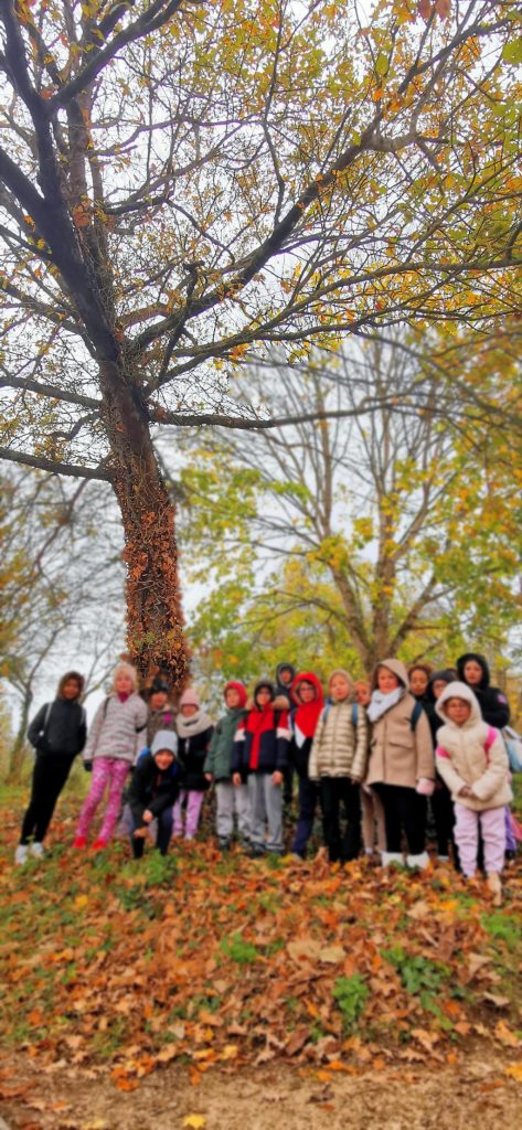Pour mesurer la taille de notre chêne pédonculé, on s’est pris en photo devant le chêne puis on a reporté la taille de Kayla qui était au pied de l’arbre.