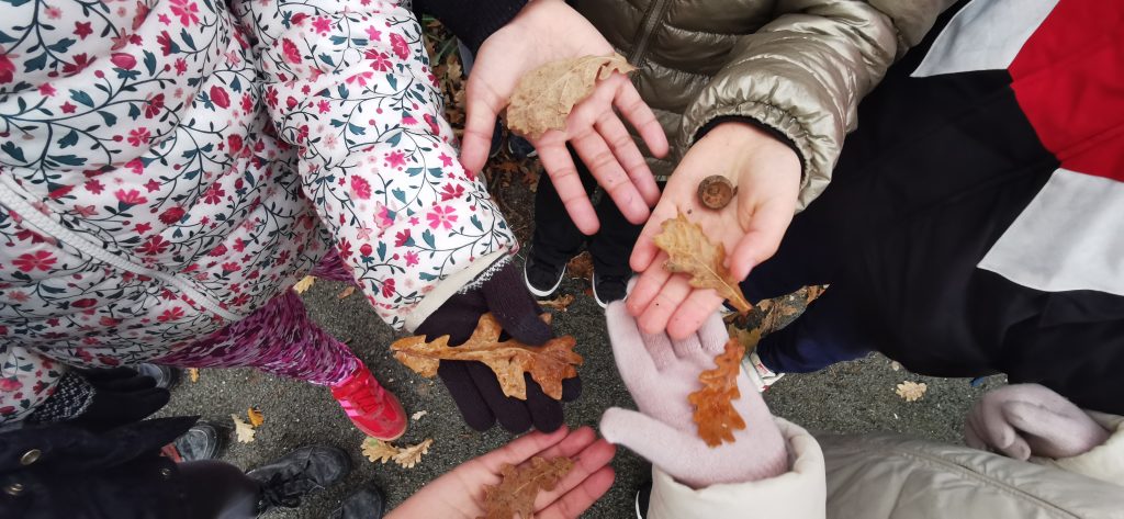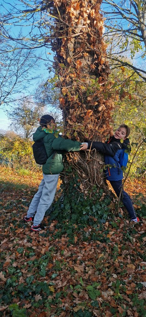 Pour la circonférence, Ulysse et Léandro ont encerclé l’arbre et on les a pris en photo. De retour en classe, ils ont reproduit leur encerclement et nous avons mesuré avec un mètre ruban.
